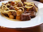 Splash a little of the water from the spaghetti into the pan with the venison then drain the spaghetti and stir it in with the meat.