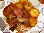 Lower the heat to 160C and put the rabbit back in the oven for another 20 mins until the bacon is crisp.